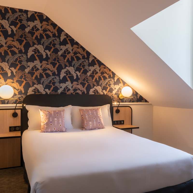 Située au troisième étage de l’hôtel, cette jolie chambre mansardée vous offre un cadre idéal pour vos escapades romantiques.