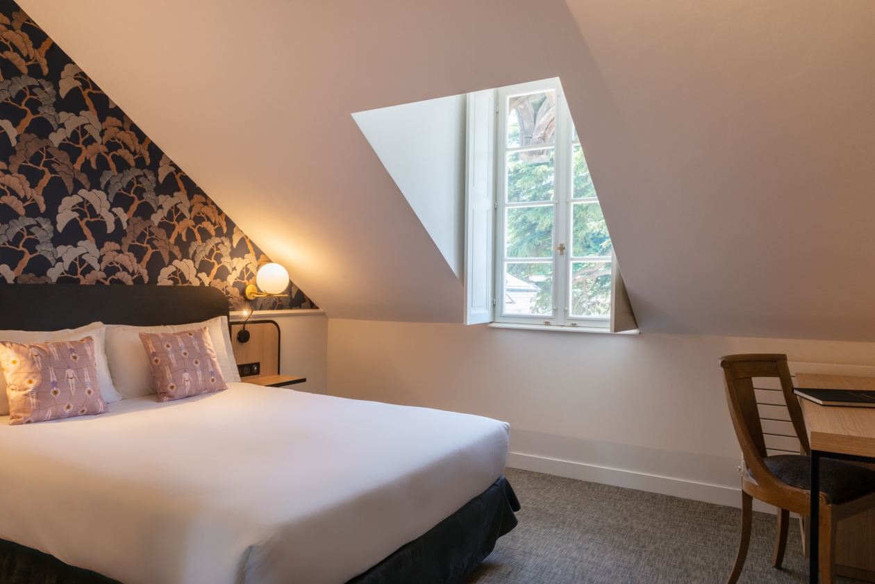 Située au troisième étage de l’hôtel, cette jolie chambre mansardée vous offre un cadre idéal pour vos escapades romantiques.
